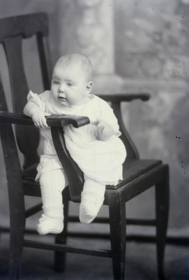 Photo of a baby who is seated on a wooden chair with one leg through the arm of the chair. The child is wearing a white dress and grasping the arm of the chair with its right hand. A.W. Reed paid for this photo.